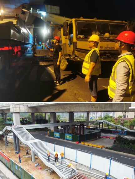 由于人行天橋項目建設所處的位置地下含高壓線等管線,施工環境較為復雜,且又處在交通通行量大的東環高速高架橋下,由于空間受限,鋼箱梁吊裝與高架橋最近的距離僅有5公分,吊裝難度極大。為此,我們采取雙吊車協同施工、錯峰施工和夜間施工的辦法。為確保施工安全,市政集團從上至下高度重視,由集團領導帶隊,項目總工及各職能部門主要人員齊上陣,從交通協調,運梁車跟隨指導,安全措施落實及現場架梁的線位等多方面進行把控,主要負責人靠前指揮,帶領黨員干部及時協調解決吊裝過程中遇到的問題,充分發揮出黨支部戰斗堡壘和黨員的模范帶頭作用。